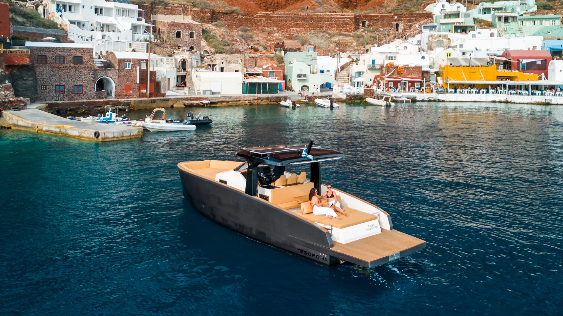 Immerse in the luxury and high aesthetics of the iconic Tesoro T40 yacht taking you on a journey to the remarkable Santorini landscapes.